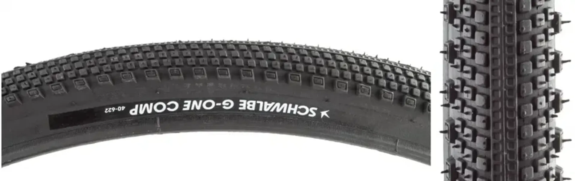 Fast rolling, inverted center tread line sandwiched between rows of tightly spaced, small square knobs with larger more pronounced shoulder knobs.